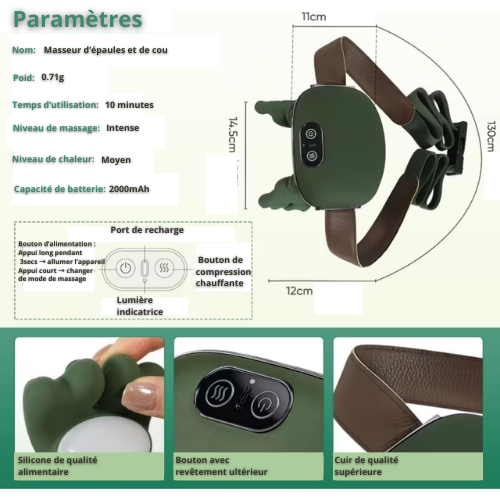 Avec ce masseur électrique pour cou et épaules, profitez d’un massage efficace en seulement quelques minutes, sans effort ni préparation. Facile à utiliser, il vous permet de relâcher vos tensions rapidement et de profiter d’un moment de détente où que vous soyez.